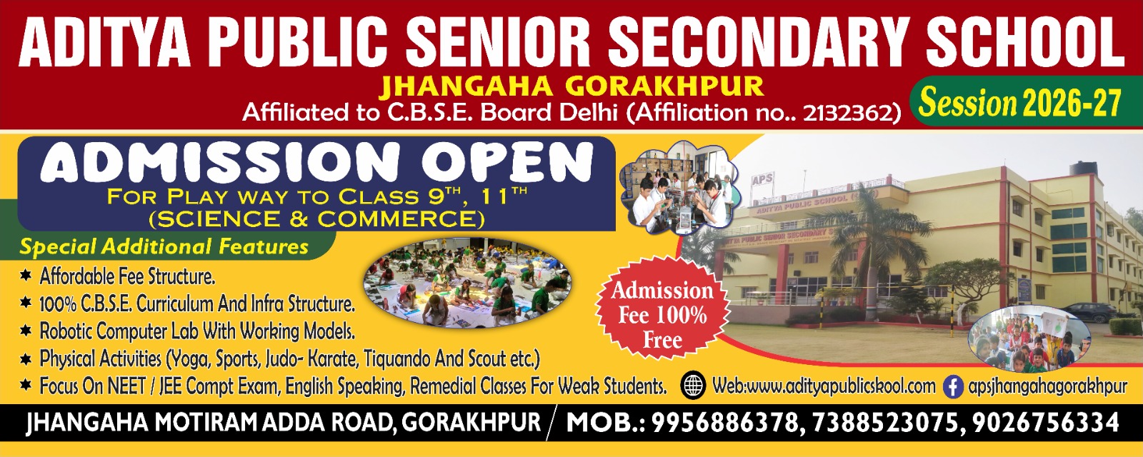 Aditya Public Senior Secondary School, Jhangaha, Gorakhpur is an English Medium School is established by Mr. Sanjay Kumar Singh under registered trust. The school is situated at Jhangaha, Motiram Adda Road 20km from Gorakhpur Railway Station on Motiram Adda- Jhangaha road. The School has a calm and quite green atmosphere away from the din of the city.